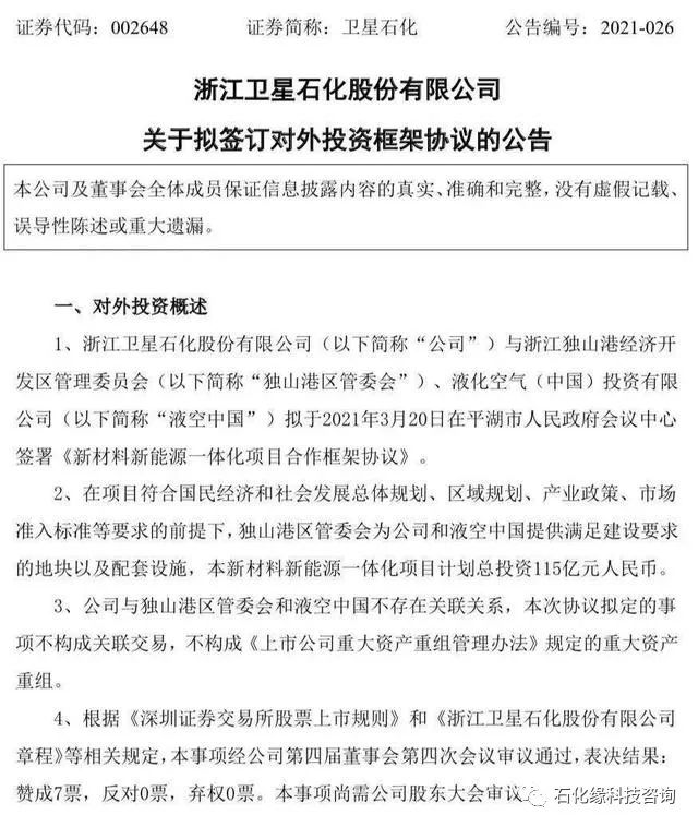 近日,衛(wèi)星石化發(fā)布公告稱,公司與浙江獨(dú)山港經(jīng)濟(jì)開發(fā)區(qū)管理委員會(簡稱“獨(dú)山港區(qū)管委會”)、液化空氣(中國)投資有限公司(簡稱“液空中國”)擬于2021年3月20日在平湖市人民政府會議中心簽署《新材料新能源一體化項(xiàng)目合作框架協(xié)議》。