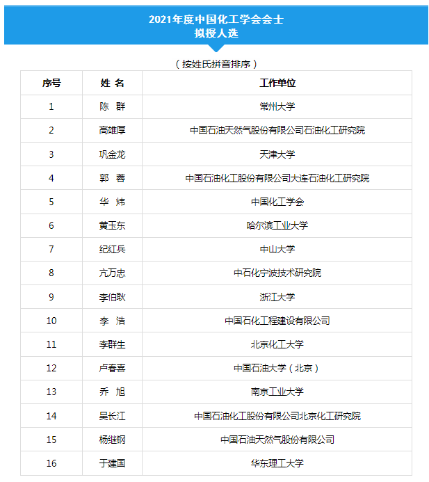 根據《中國化工學會會士條例》和《中國化工學會會士評選工作實施方案》,中國化工學會于2021年1月啟動了2021年度中國化工學會會士的評選組織工作。經學會會士和有關單位提名、形式審查、專家初評、會議最終評審等程序,評選出陳群等16人擬授予中國化工學會會士,現將擬授予人選予以公示。
