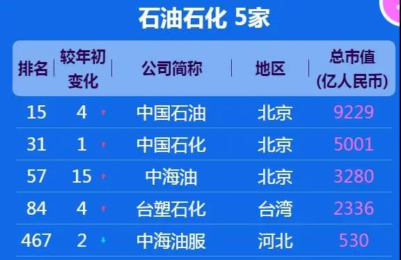 石油石化行業有5家進入500強,中國石油總市值為9229億元,位居行業第一;中國石化為5001億元;中海油為3280億元;臺塑臺化2336億元;中海油服530億元。