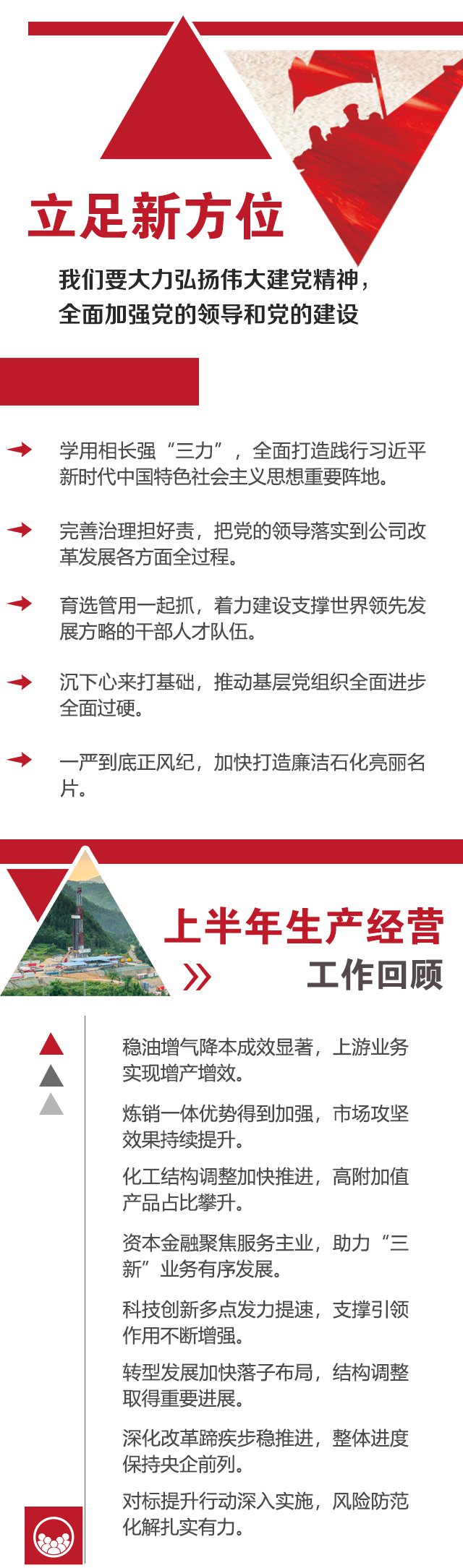 馬永生在報告中指出,今年以來,面對難得的經營發展機遇,我們全力抓優化、調結構、拓市場、促改革、謀發展、防風險,穩油增氣降本成效顯著,上游業務實現增產增效;煉銷一體優勢得到加強,市場攻堅效果持續提升;化工結構調整加快推進,高附加值產品占比攀升;資本金融聚焦服務主業,助力“三新”業務有序發展;科技創新多點發力提速,支撐引領作用不斷增強;轉型發展加快落子布局,結構調整取得重要進展;深化改革蹄疾步穩推進,整體進度保持央企前列;對標提升行動深入實施,風險防范化解扎實有力,高質量打好“上半場”,高水平實現“雙過半”。