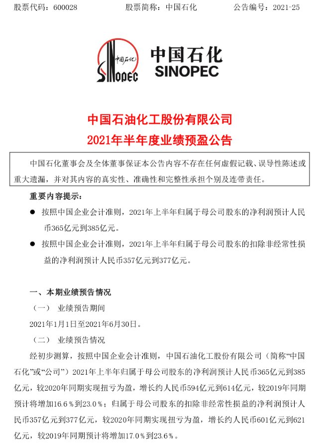 中國石油化工股份有限公司2021年半年度業績預盈公告