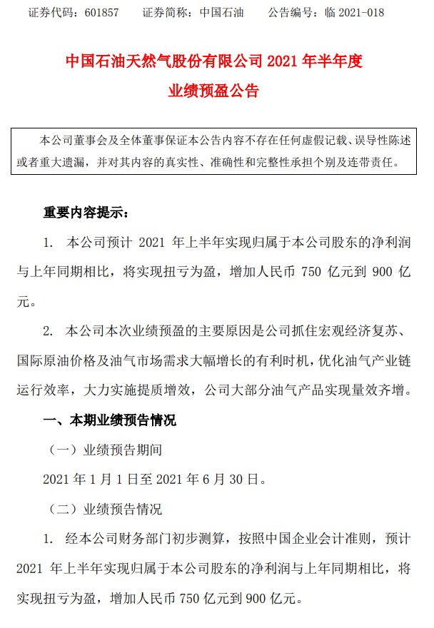 中國石油天然氣股份有限公司 2021 年半年度業績預盈公告
