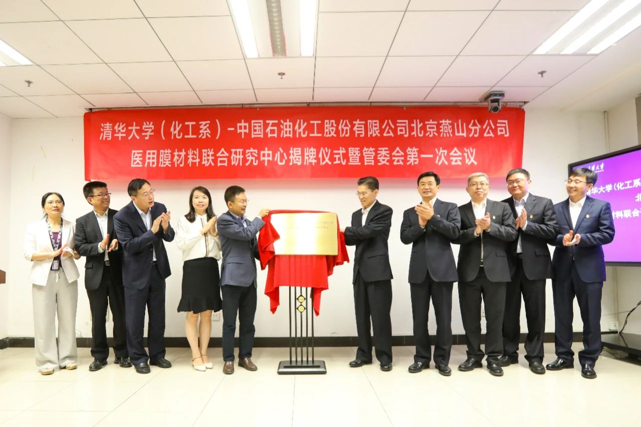 在現(xiàn)場人員的共同見證下,李剛、王鐵峰為清華大學(化工系)——燕山石化醫(yī)用膜材料聯(lián)合研究中心揭牌,并合影留念。
