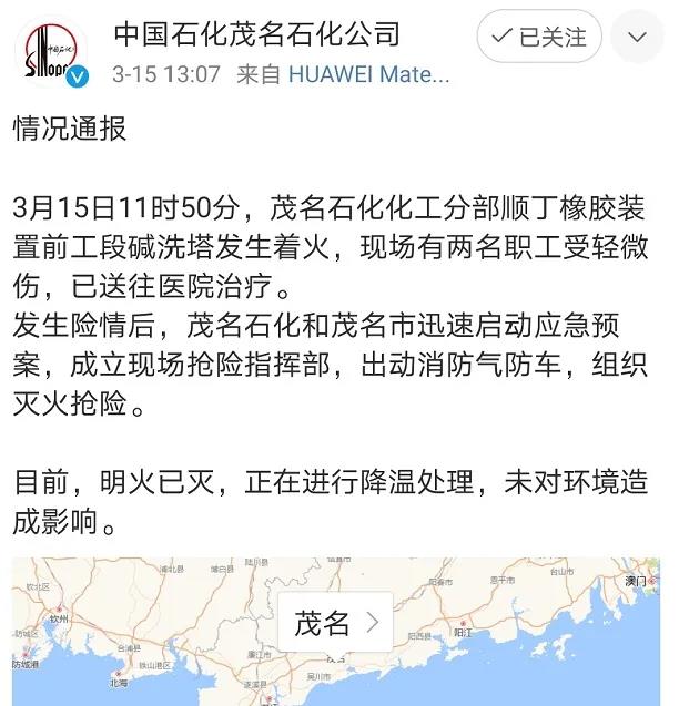 3月15日11時50分,茂名石化化工分部順丁橡膠裝置前工段堿洗塔發生著火,現場有兩名職工受輕微傷,已送往醫院治療。