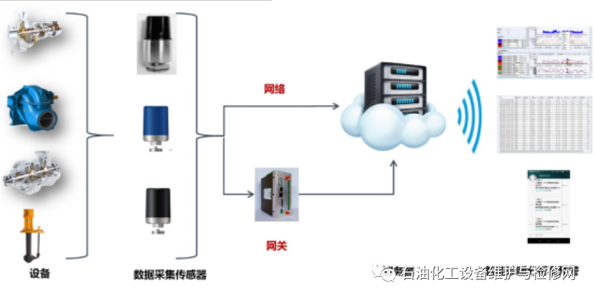 在機泵上安裝便攜式傳感器,用來采集相應數據(如:軸承溫度、泵振動值等),傳感器可以采用有限或無線智能傳感器,近幾年無線傳感器技術已相對成熟,無線傳感器具有安裝便捷、快速等特點,結合設備的重要性和安裝條件,可以綜合考慮無線傳感器與有線傳感器來實現數據采集。
