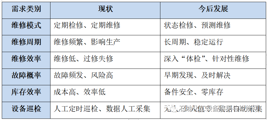 隨著社會的發展、科技的進步,工業企業對健康、環保、安全等方面的要求越來越高。石油石化行業設備的安全與可靠運行也越來越受到人們的關注。數十年來,其維護方式多為被動式維護(設備已經失效,進行事故后維修)或預防性維護(通過采取適當的措施,如提高強度等,從而防止設備發生故障),未來對機泵設備的發展已呈現出智能化發展的需求,主要體現在以下幾個方面: