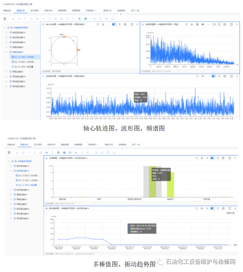 對采集的數據(軸承溫度、泵振動等)進行分析,得到變化圖譜,以振動為例,主要對收集的數據進一步轉化成波形圖和頻譜圖進行分析,得到具體引起振動的原因,有針對性的提前采取預防措施。