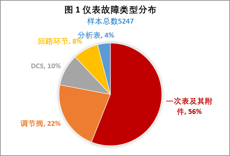 圖1~5是利用電子作業票系統統計的某大型企業從2014年1月到2015年7月期間的儀表故障數據(注:數據已剔除了非故障的作業次數,如配合改造項目以及檢查無問題的作業次數)。圖1中的統計數據表明,儀表故障排名依次為:一次表及其附件、調節閥、操作站、回路環節、分析表。圖2~5則進一步說明了圖1各部分的組成和故障比例。