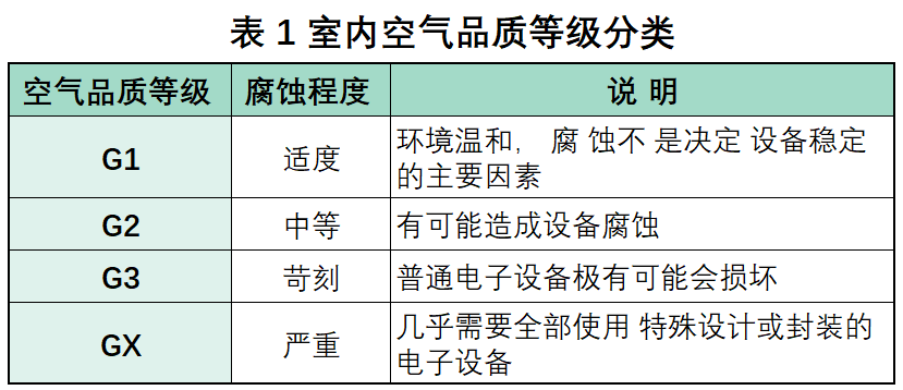 治理DCS機柜間的空氣質量是延長回路環節元件壽命的一個重要手段。現階段,很多煉化企業通過改造,把原先分散在裝置旁邊的小操作室撤并,建設成了集中中央操作室(CCR),同時現場機柜間通過兼并原先的小操作室也有所擴大。但現場機柜間的一個共性問題是密封效果很差,室外腐蝕性氣體很容易侵入,導致DCS配套的安全柵、繼電器及鈕子開關等附件氧化腐蝕加劇,實踐中常發現端子上有發黑現象。根據ANSI/ISA-71.04-1985關于空氣品質等級的劃分,室內的空氣等級可以分為4類,詳見表1室內空氣品質等級分類: