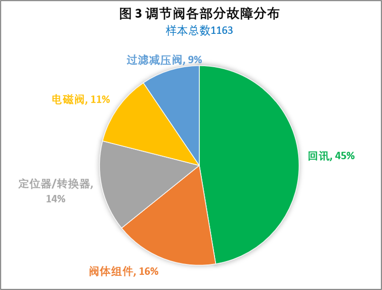 調節閥的運行效果,直接影響到裝置運行的平穩。由圖1可以看出,調節閥的故障占總儀表故障率的約1/5,而調節閥附件的故障又在其中占了大部分比例,有文獻指出煉油廠加氫裂化裝置的調節閥附件故障占了該裝置調節閥總故障的33.6%。若統計數據擴大到石化廠的全部裝置,特別是包含油品儲運裝置的氣缸閘閥時,這個數據就遠不止如此了,從圖3可以發現,回訊故障能占到調節閥總故障量的45%。由于多數回訊并不參與聯鎖,回訊故障對裝置的平穩運行威脅并不大。