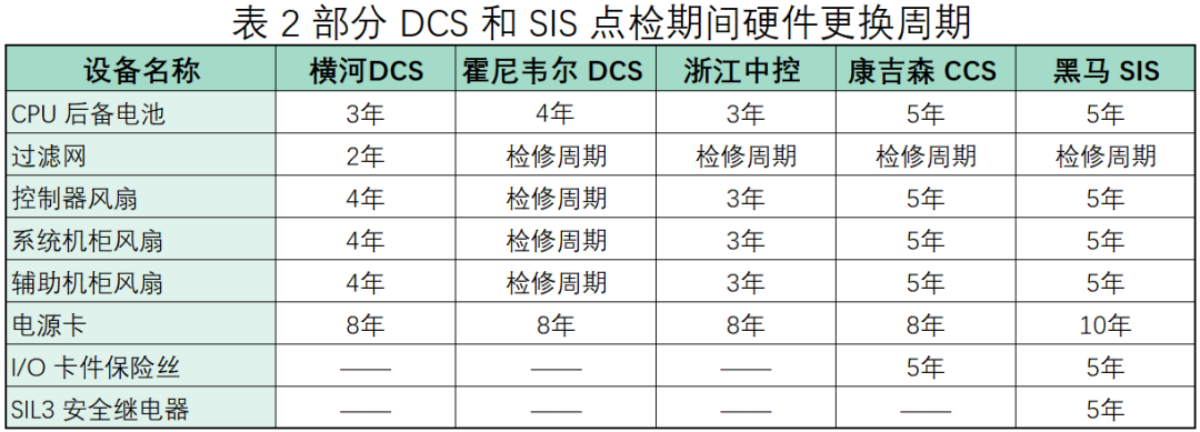 一般在一個檢修周期后就要對DCS進行點檢,點檢包括通過專門軟件來檢查系統性能并備份軟件、查殺病毒等,以及針對卡件除塵和從壽命考慮的硬件更換,硬件主要有:CPU后備電池、過濾網、各類風扇、電源卡及保險絲等。表2列出了部分主要系統廠商硬件的建議更換年限。
