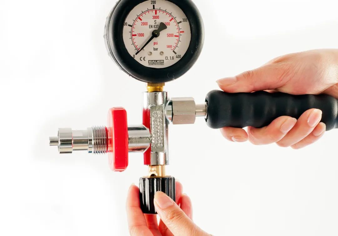 將充氣閥再開一次,把充氣閥和充氣軟管里面的氣放掉再看一下呢。