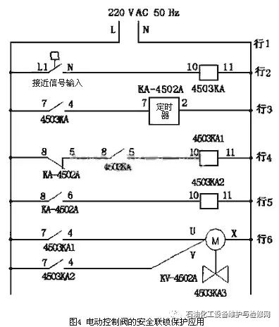 1.2電動(dòng)控制閥的安全聯(lián)鎖保護(hù)電動(dòng)控制閥的電動(dòng)執(zhí)行器是以220V交流單項(xiàng)電源作為驅(qū)動(dòng)電源,接受來自調(diào)節(jié)器的毫安信號(hào)或電壓控制信號(hào)來進(jìn)行工作的。現(xiàn)在國(guó)內(nèi)的電動(dòng)控制閥大多采用進(jìn)口的日本工裝電子式電動(dòng)執(zhí)行器,電子式控制單元常被設(shè)計(jì)成黑匣子形式,并用樹脂澆鑄,驅(qū)動(dòng)電機(jī)采用交流可逆電機(jī),可以正驅(qū)動(dòng)或反驅(qū)動(dòng);驅(qū)動(dòng)量的反饋檢測(cè)采用高性能的、高可靠性的電位器,以實(shí)現(xiàn)控制調(diào)節(jié)功能。切斷或調(diào)節(jié)電動(dòng)控制閥的安全聯(lián)鎖保護(hù)歸根結(jié)底是通過安全聯(lián)鎖信號(hào)對(duì)驅(qū)動(dòng)電機(jī)的驅(qū)動(dòng)電源的控制,以實(shí)現(xiàn)驅(qū)動(dòng)電機(jī)的正轉(zhuǎn)或反轉(zhuǎn),來達(dá)到對(duì)控制閥的打開或關(guān)閉的目的。因此只要將安全聯(lián)鎖信號(hào)作為接點(diǎn)信號(hào)接人電動(dòng)控制閥的電源控制回路中,當(dāng)安全聯(lián)鎖信號(hào)動(dòng)作時(shí),也就是接點(diǎn)信號(hào)動(dòng)作,使得正驅(qū)動(dòng)電源或反驅(qū)動(dòng)電源接通,實(shí)現(xiàn)控制閥的打開或關(guān)閉。圖4所示為電動(dòng)控制閥較復(fù)雜的安全聯(lián)鎖保護(hù)接線圖,通過接入定時(shí)器聯(lián)鎖控制電動(dòng)控制閥的打開和關(guān)閉。在圖4行2中,引入安全聯(lián)鎖保護(hù)接點(diǎn)信號(hào),接點(diǎn)閉合時(shí),繼電器4503KA線圈得電,行3中4503KA常開接點(diǎn)7-4閉合,定時(shí)器KA-4502A開始計(jì)時(shí),行4中4503KA常開接點(diǎn)8-5閉合,繼電器4503KA1線圈得電,行6中4503KA1常開接點(diǎn)7-4閉合,電動(dòng)控制閥4503KA3正轉(zhuǎn),閥門打開;當(dāng)定時(shí)器KA-4502A計(jì)時(shí)到設(shè)定值時(shí),其觸點(diǎn)動(dòng)作,行4中定時(shí)器KA-4502A常聞接點(diǎn)8-5打開,繼電器4503KA1線圈失電,行6中4503KA1常開接點(diǎn)7-4打開,電動(dòng)控制閥4503KA3正轉(zhuǎn)失電,同時(shí)行5中KA-4502A觸點(diǎn)8-6閉合,繼電器4503KA2線圈得電,行6中4503KA2常開接點(diǎn)7-4閉合,電動(dòng)控制閥4503KA3反轉(zhuǎn)得電,閥門關(guān)閉。