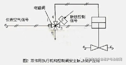 1.1.2雙作用執(zhí)行機(jī)構(gòu)控制閥安全聯(lián)鎖保護(hù)雙作用氣動(dòng)控制閥使用彈簧復(fù)位或無彈簧執(zhí)行機(jī)構(gòu),安全聯(lián)鎖動(dòng)作時(shí)關(guān)閉或打開控制閥。其應(yīng)用如圖2所示。