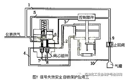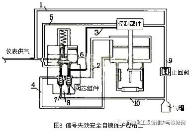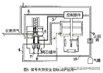 2.1.1信號(hào)失效氣動(dòng)控制閥全開或全關(guān)安全保護(hù)在圖5中,1號(hào)管路為儀表供氣管路,2號(hào)管路為給氣缸頂部壓力的管路,3號(hào)管路為給氣缸頂部控制壓力的管路,4號(hào)管路為給氣缸底部壓力的管路,5號(hào)管路為給氣缸底部控制壓力的管路,6號(hào)為鎖定部件上下膜片來回運(yùn)動(dòng)的排氣口,7號(hào)為儲(chǔ)氣罐提供給氣缸底部的供氣口,8號(hào)為儲(chǔ)氣罐提供給氣缸頂部的供氣口,9號(hào)管路為儲(chǔ)氣罐提供給控制部件供氣壓力的管路,10號(hào)管路為儲(chǔ)氣罐提供給氣缸頂部或底部供氣壓力的管路。