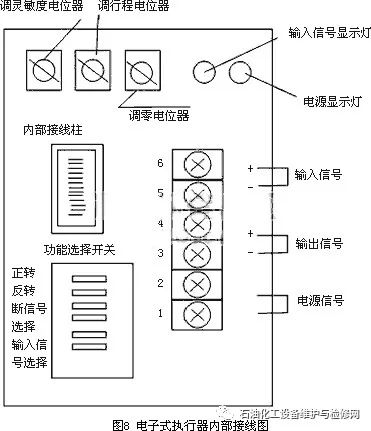 在以上的信號(hào)失效控制閥安全保護(hù)示意圖中,止回閥在信號(hào)失效時(shí),會(huì)保證儲(chǔ)氣罐的儲(chǔ)氣壓力輸送到氣缸的頂部、底部或頂部和底部。當(dāng)供氣壓力恢復(fù)到正常時(shí),止回閥恢復(fù)到原來的位置,以保證儲(chǔ)氣罐充滿所需要的氣壓,以備下次信號(hào)失效時(shí)繼續(xù)發(fā)揮它的作用。2.2信號(hào)失效電動(dòng)控制閥的安全保護(hù)電動(dòng)控制閥的關(guān)鍵部件在于其內(nèi)部樹脂澆鑄的控制器,其接受來自調(diào)節(jié)器的毫安或電壓信號(hào)和來自開度檢測(cè)器的開度信號(hào),將兩信號(hào)相比較并放大,向消除其差值的方向驅(qū)動(dòng)和控制電機(jī),其結(jié)果是使得來自調(diào)節(jié)器信號(hào)和開度信號(hào)之間的偏差被減小,當(dāng)偏差消除時(shí)控制部分令電機(jī)停止在該位置上,達(dá)到調(diào)節(jié)和控制的目的。當(dāng)信號(hào)失效時(shí),輸出軸在相應(yīng)的時(shí)間內(nèi)仍處于運(yùn)轉(zhuǎn)狀態(tài),如果沒有相應(yīng)的控制措施,會(huì)停留在某一個(gè)位置,而失去對(duì)電動(dòng)控制閥的安全保護(hù)。根據(jù)工藝過程的需要,在電動(dòng)控制閥的設(shè)計(jì)選型和安裝過程中,就應(yīng)該注意到信號(hào)失效時(shí)電動(dòng)控制閥的安全保護(hù)。在圖8電動(dòng)控制閥電子式執(zhí)行器內(nèi)部接線圖中,信號(hào)失效時(shí)根據(jù)工藝過程的需要使閥門開度仍然處于信號(hào)失效前的位置時(shí),將圖中的3和4斷開,接通5,就可以使輸出軸停止在原位置,使閥門開度保持不變。