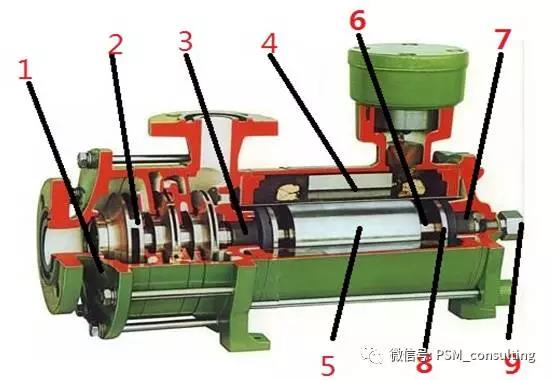 1.泵體 2.葉輪 3.前導軸承 4.定子 5.轉子 6.軸 7.后導軸承 8.推動盤 9.軸承監視器