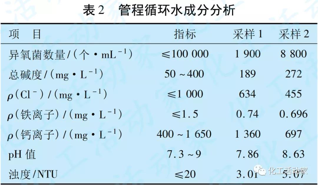 冷卻介質為工業循環水,其中主要腐蝕成分為Cl-、微生物、溶解氧、生物黏泥及其他雜質等。經檢測,循環水流速僅為0.2m/s,循環水流速低,管束易產生局部沉積,沉積物覆蓋在管束內表面,導致細菌嚴重繁殖,加劇了垢下腐蝕。循環水指標要求及成分見表2。