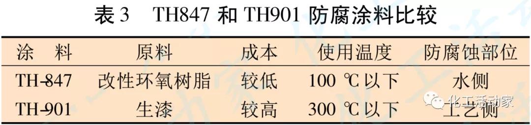 裝置水冷器管束內表面使用TH-847防腐蝕涂料,TH-847是CH-784或7910水冷器專用涂料的改進產品。20世紀90年代,我國又研制出耐溫性較好的TH-901/902防腐涂料,目前應用較普遍,防腐后水冷器使用周期為3~5a。兩種TH系列涂料的比較見表3。