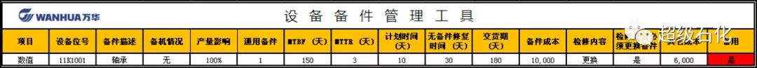 ⑴備件策略確定。傳統的備件策略的確定缺少科學的理論依據、隨意性大,工業園為了避免不合理的備件備用策略,降低庫存成本,同時最大限度的保證生產裝置的穩定運行,結合多年的備件采購及設備維護經驗,利用辦公軟件的函數工具及數學模型,綜合考慮物資采購周期、設備及備件價值、故障影響程度、故障周期指標及裝置生產經濟指標等因子,建立備件備用策略的判斷工具,指導工程師決策備件是否備庫。從而實現利用科學的算法管理備件備庫工作,為降低備件庫存成本提高公司資金利用率奠定理論基礎。