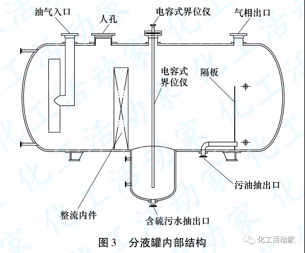回流罐中增加強化油水分離內(nèi)件,主要是預分離設(shè)施、整流聚結(jié)設(shè)施、隔板、電容式界位儀等。通過擴大水相區(qū)容積,提高污水的沉降時間,并進行有效、準確的檢測,改造后取得了較好的油水分離效果,且界位控制穩(wěn)定。分液罐內(nèi)件見圖3。