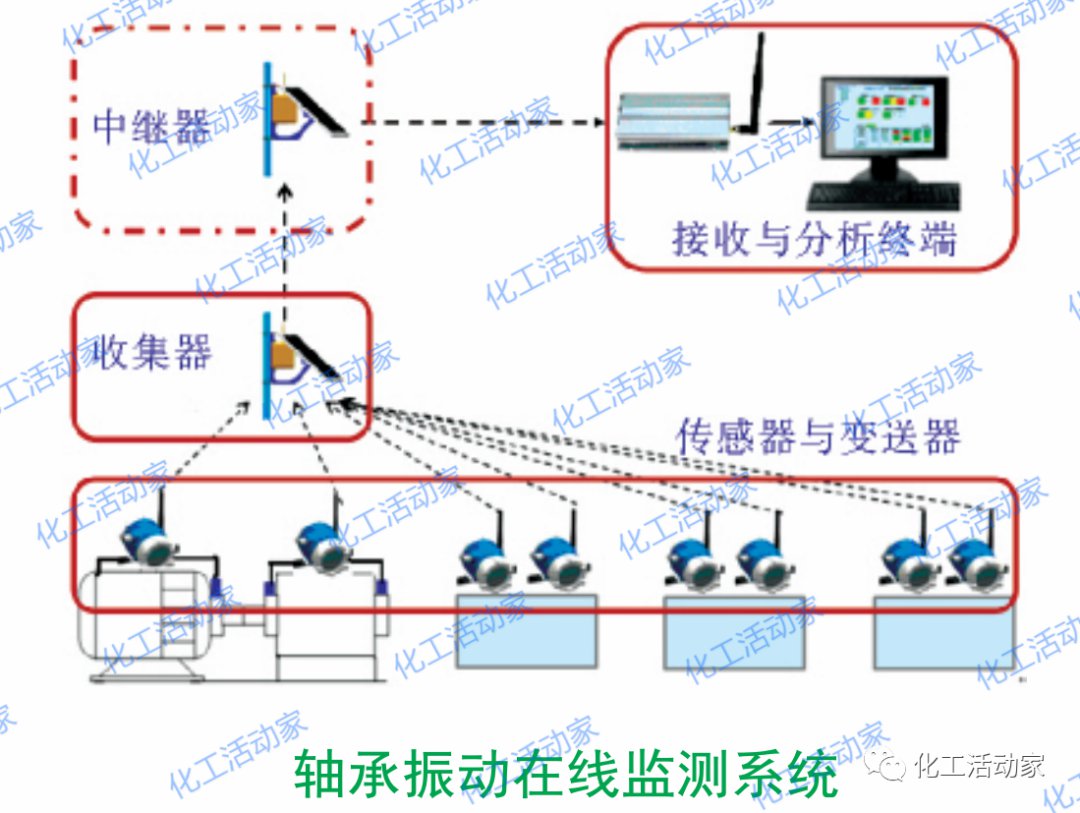 軸承振動(dòng)在線監(jiān)測(cè)系統(tǒng)硬件部分主要由傳感器單元、變送器單元、數(shù)據(jù)傳輸中繼器單元、數(shù)據(jù)接收器與監(jiān)控主機(jī)5部分組成。