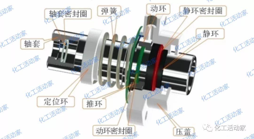 在填料箱內(nèi)的泵軸上裝有傳動(dòng)座,傳動(dòng)座用傳動(dòng)螺釘固定在泵軸上,在推環(huán)與傳動(dòng)座之間裝有大圓柱彈簧,推環(huán)壓緊動(dòng)環(huán)密封圈,動(dòng)環(huán)上開有導(dǎo)向槽,傳動(dòng)座的導(dǎo)向杈深入其中,使推環(huán)與動(dòng)環(huán)隨傳動(dòng)座同步轉(zhuǎn)動(dòng)。由于防轉(zhuǎn)銷的作用,靜環(huán)不會(huì)轉(zhuǎn)動(dòng)。動(dòng)環(huán)在彈簧力的作用下與靜環(huán)貼緊形成密封斷面。泵工作時(shí)動(dòng)環(huán)上作用的液體壓力使動(dòng)環(huán)進(jìn)一步貼緊靜環(huán),并在密封端面內(nèi)形成一層極薄的液膜,從而達(dá)到良好的密封效果。