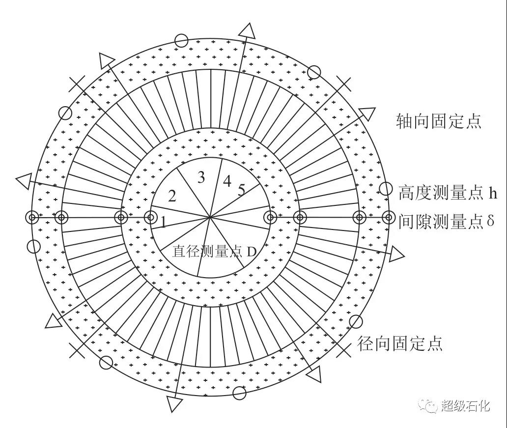 c)隔板樺緣外徑較大且被多點固定,結合測量可行性選擇測量樺緣板上平面和修復平臺的高度作為測量點。每個測量點都標記固定,如圖4所示。