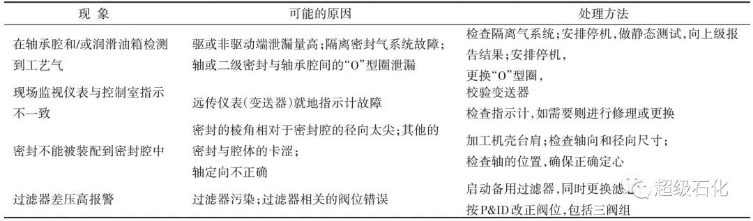 根據聚乙烯裝置循環氣壓縮機周期內出現的問題及相應檢查記錄,循環氣壓縮機干氣密封在正常狀態運行情況下,需要對各控制環節的儀表設備進行日常維護記錄工作,以保證系統運行正常。在出現故障情況下,通過故障檢查表對相對應的故障及時診斷處理。