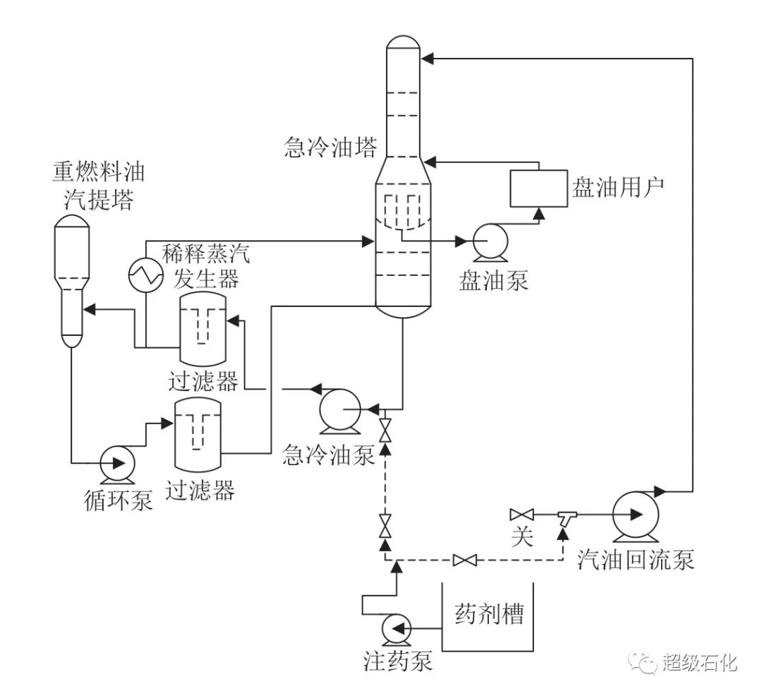 完成化學清洗后,急冷油塔停工,切換熱備爐裂解氣大閥入急冷單元,利用熱備蒸汽對急冷油塔進行蒸煮,同時分批次投用急冷油、盤油用戶和管線低點、盲點停工倒空臨時流程和重油收集罐蒸汽排放臨時流程,完成急冷油塔和兩級油系統蒸煮、倒空工作。完成急冷油塔蒸煮后,進行急冷水塔的化學清洗和急冷油塔的水淋洗。切斷急冷水和工藝水的聯系,利用工藝水汽提塔補充脫鹽水流程保證稀釋蒸汽發生系統運行,稀釋蒸汽發生器投用MS反加熱流程。