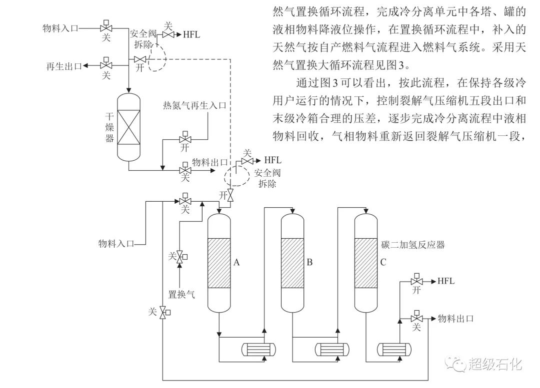 在停工過程中,由于裂解氣壓縮機增加了天然氣停工環節,流程內大部分系統完成了破液封操作,對于不在停工置換大流程內的乙烯精餾塔、乙烯機、丙烯機、丙烯精餾塔、脫乙烷塔、碳三液相加氫反應器需單獨進行物料回收。