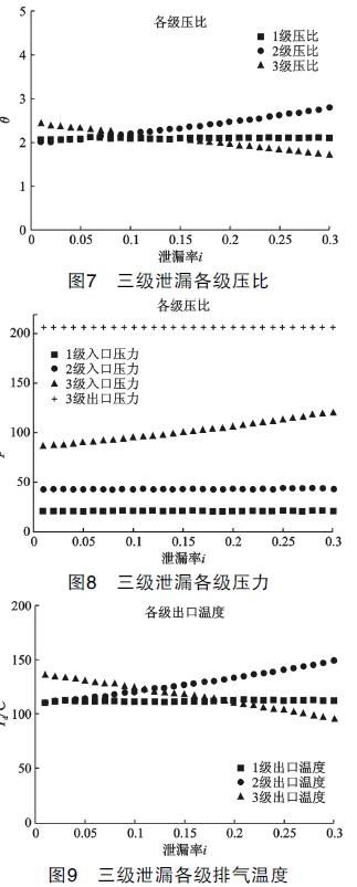 借鑒文獻[4]提供的計算方法,筆者對其泄漏影響規律進行了仿真計算,具體計算公式及復算過程,這里不再贅述。該模型的邊界及假設條件:(1)不考慮氣閥、活塞環等內漏情況導致的氣體溫升;(2)不考慮泄漏時,壓比、溫升對過程指數的影響;(3)壓縮機一級進氣壓力、三級排氣壓力由系統提供,不受漏氣影響;(4)復算精度大于等于0.99時,迭代計算結束。