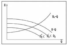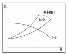 在裝置特性曲線HZ-Q不變的情況下,泵的運行工況點在M點,流量為QM,揚程為HM。當期望揚程增加到HA時,泵的特性曲線上移成H1-Q1時,工況點也從M點變成B點,此時工況點流量變成QB,揚程變成HB,此時流量和揚程分別增加了ΔQ1和ΔH1。泵的實際運行工況點偏移到大流量點,泵內(nèi)流速增加,流阻損失也隨之增加,造成泵體內(nèi)部流動不穩(wěn)定,容易引起進口管路中的壓力脈動,引發(fā)振動。此外,還可能發(fā)生電機超載,導致泵壽命縮短。