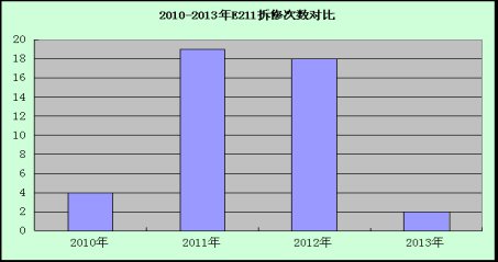 催化油漿蒸汽發生器E211檢修頻次顯著下降。自2010年大檢修開工以來,E211檢修次數由2013年以前的共計41次降低到2013年全年僅2次。E211拆修次數對比見圖10。
