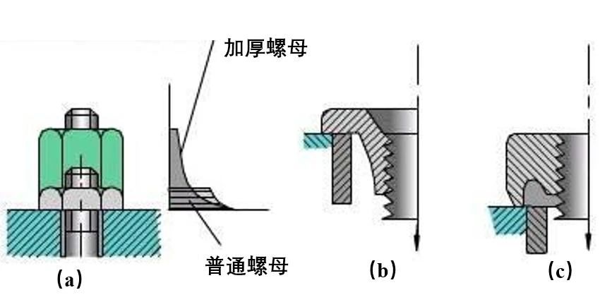 所以,采用圈數多的厚螺母,并不能提高聯接強度。若采用圖1(b) 的懸置(受拉)螺母,則螺母錐形懸置段與螺栓桿均為拉伸變形,有助于減少螺母與栓桿的螺矩變化差,從而使載荷分布比較均勻。圖 1(c)為環槽螺母,其作用和懸置螺母相似。