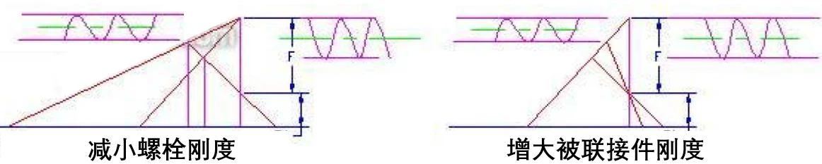 螺栓的最大應力一定時,應力幅越小,疲勞強度越高。在工作載荷和剩余預緊力不變的情況下,減小螺栓剛度或增大被聯接件的剛度都能達到減小應力幅的目的(見圖 5),但預緊力則應增大。