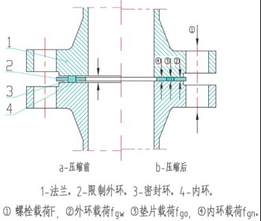 如圖1-b所示,密封件設(shè)置限制環(huán),在密封連接部件安裝的時(shí)候,保證法蘭金屬表面直接接觸(指凹凸面法蘭或隼槽法蘭)或和密封件限制環(huán)金屬表面接觸,并保證在密封服役期內(nèi),始終保持金屬面的接觸,螺栓載荷通過法蘭面分別作用于密封面和金屬限制環(huán)上,從而保證了密封工作應(yīng)力在密封服役期間的恒定。