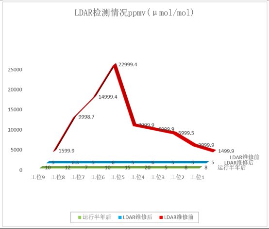 恒應(yīng)力墊片已成功應(yīng)用于石油化工各高溫、高壓、溫度壓力交變工況等苛刻環(huán)境下,解決了密封宏觀泄漏問題,并實(shí)現(xiàn)了對VOCs排放的有效控制,以某石化采用恒應(yīng)力密封墊片LDAR修復(fù)前和修復(fù)后對比為例,從最高2萬多 ppmv(μmol/mol)在第一次修復(fù)后所有部位降到了10ppmv以下,單點(diǎn)最高減排率為99.974%,運(yùn)行半年后泄漏最高值不超過20ppmv。