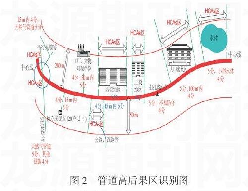 高后果區是指如果管道發生泄漏或斷裂等事故,會對公眾安全、財產、環境、社會等造巨大損失的區域,隨著人口和環境資源的變化,高后果區的地理位置和范圍也會隨著改變。經過管線與周邊環境的相對位置、管線易產生打孔盜油點情況進行分析,研究形成了《管道高后果區評價準則和評分細則》,其可視化展示如圖2所示。